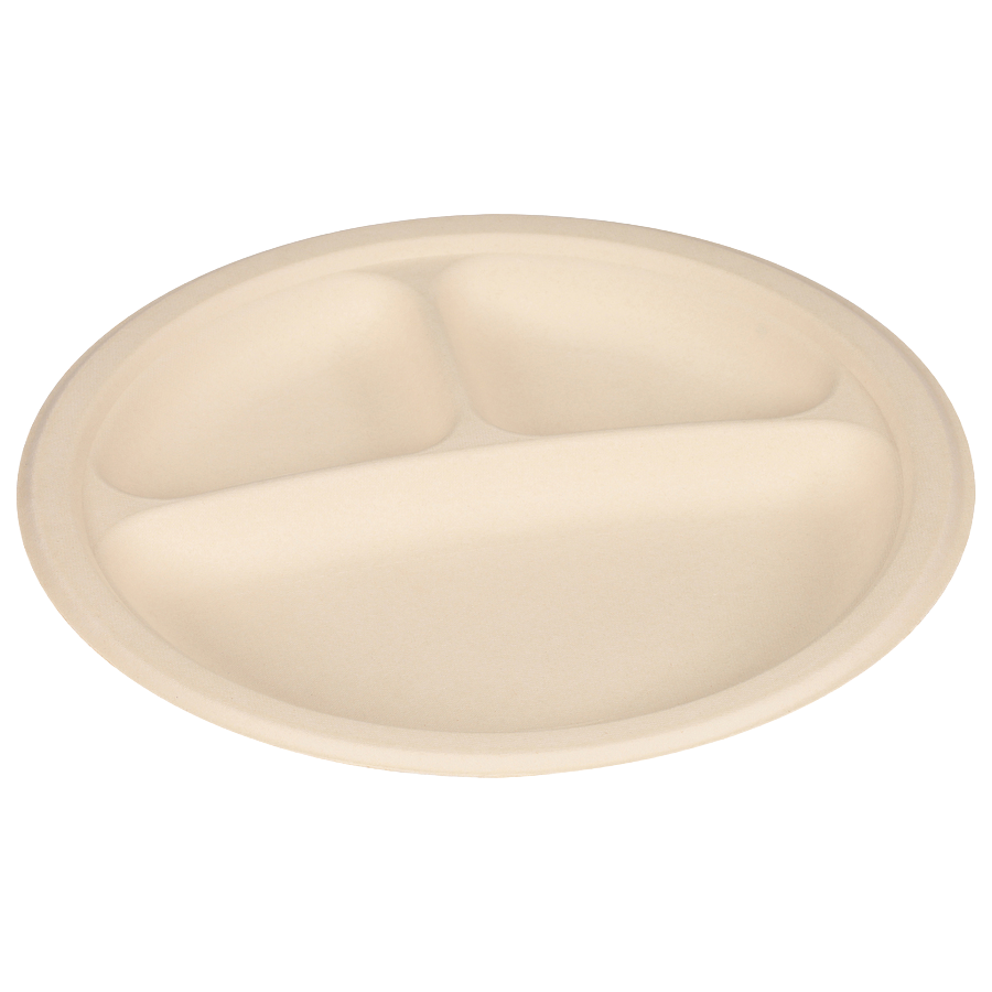 These Tellus Classic 9" 3-compartment round plates have no added PFAS, are oil and grease resistant, and are ideal for both hot and cold foods. These plates are kosher certified, compostable in a commercial composting facility in under 3 months, and made in the USA with US and imported renewable plant fibers. Offering a dependable tableware solution, our products work well with a wide variety of foodservice applications.